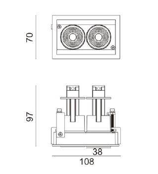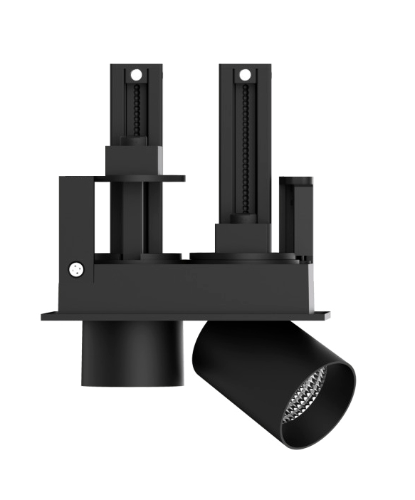 Multifunksjonell downlight designet med opptrekt lyskilde, som sørger for lav blending. Roterbar 355º, tiltbar 80º, opp og ned bevegelse på 50 mm