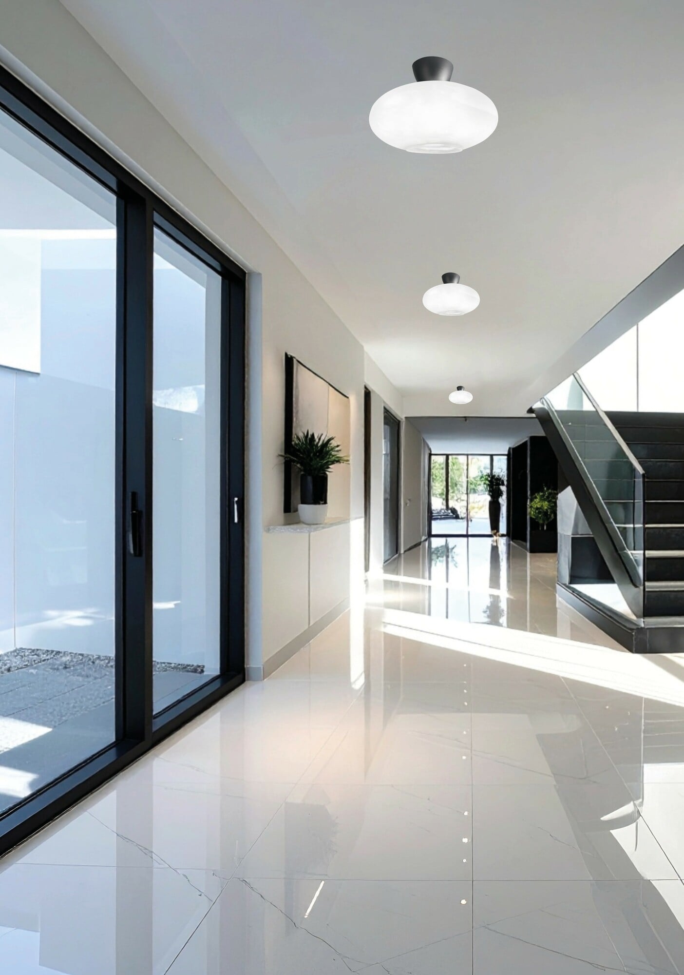 Dekorativ taklampe som kommer i fargene hvit, sort og messing, som skal benyttes med valgfri glasskjerm. Velg enten hvit eller klart glass. E27-sokkel.