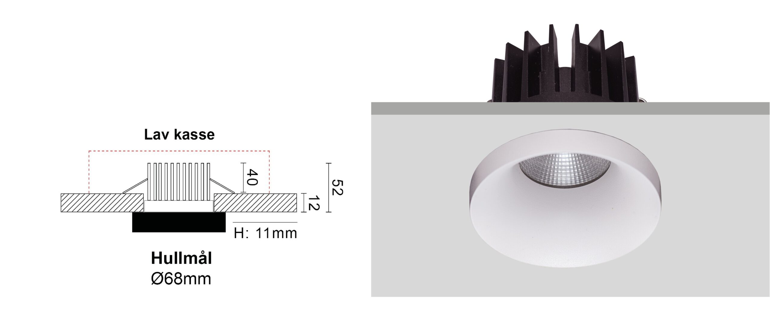 Downlightserien består av flere deler. Downlighten bygger 11mm ned fra taket, som gir et stilig og moderne uttrykk.