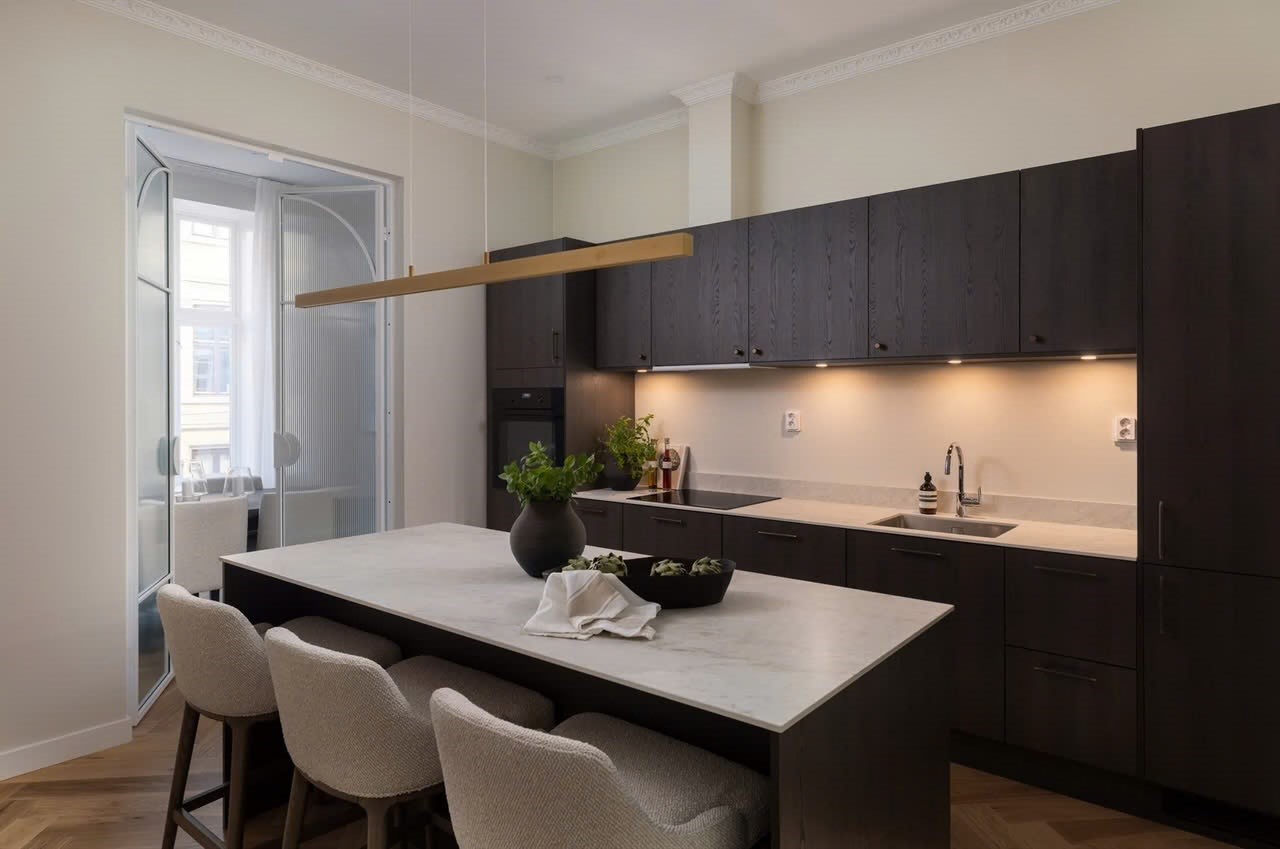 Slank og stilren pendel i avlangt design. Pendelen gir en ren linje med lys og passer perfekt over et spisebord/ kjøkkenøy. Leveres med 150cm ledning, hvor høyden enkelt kan reguleres før og etter montering.