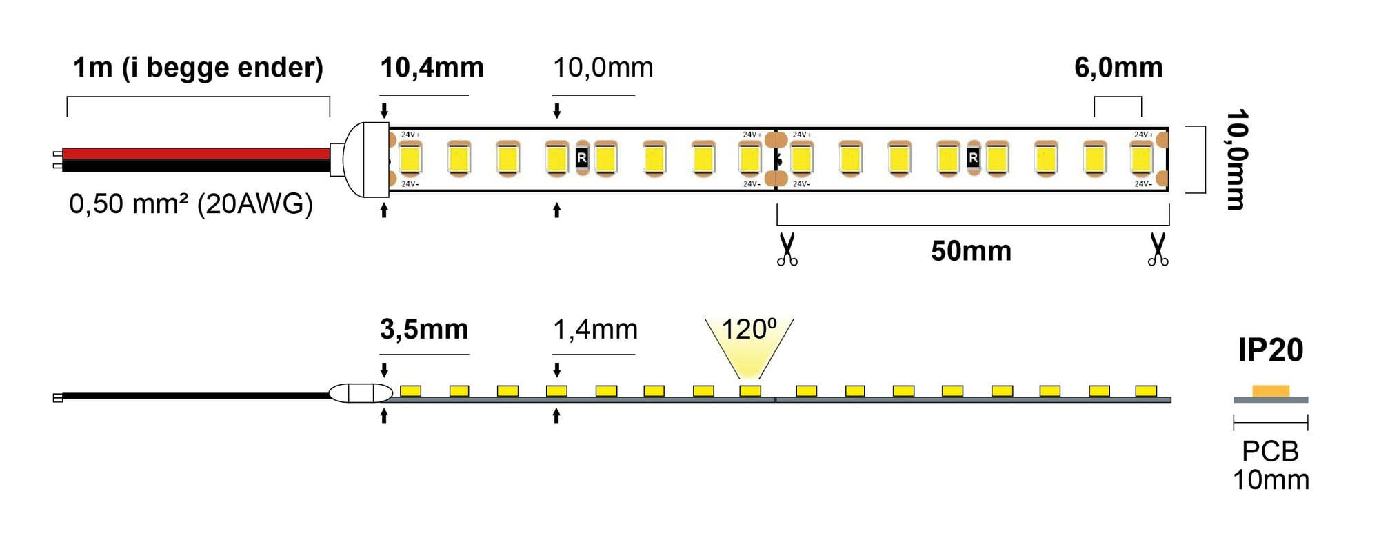 - Kabellengde: 1m (i hver ende)