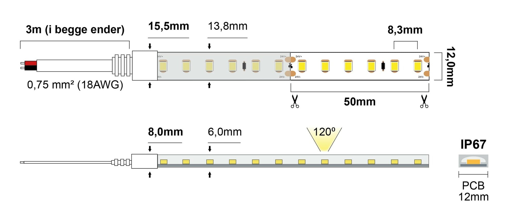 | Lyskilde | 1200xSMD2835, 3000K - 1130lm/m - CRI>90 |