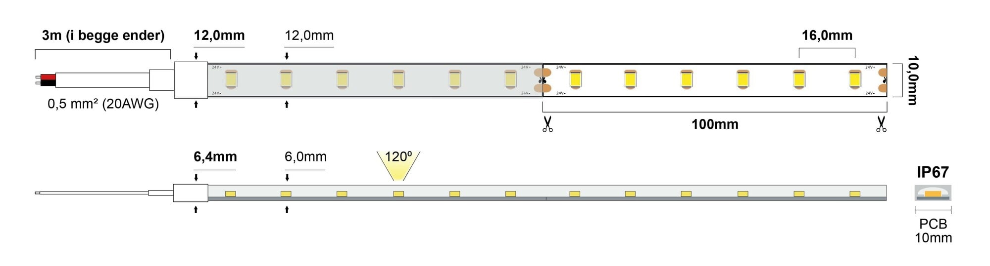 | Lyskilde | 1200xSMD2835, 2700K - 510lm/m - CRI>90 |