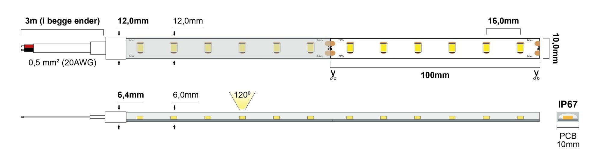 | Lyskilde | 1200xSMD2835, 3000K - 550lm/m - CRI>90 |
