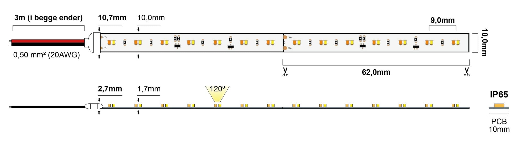 | Lyskilde | 1120xSMD2216 LED, 2300-3000K, 620lm/m 9,8W/m |