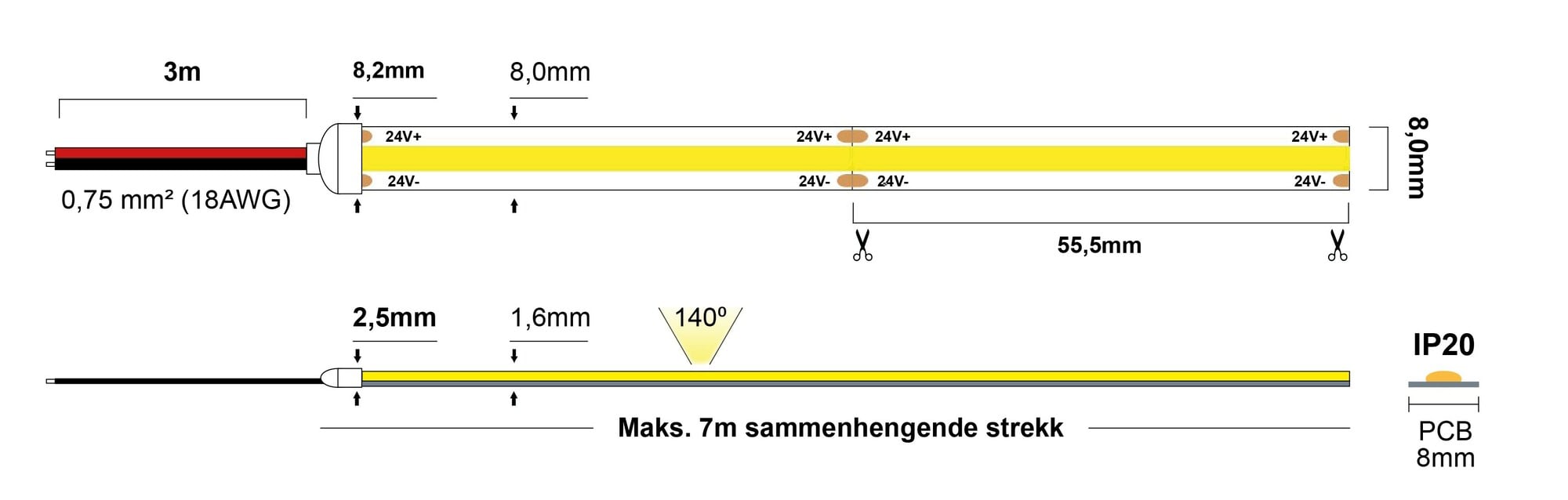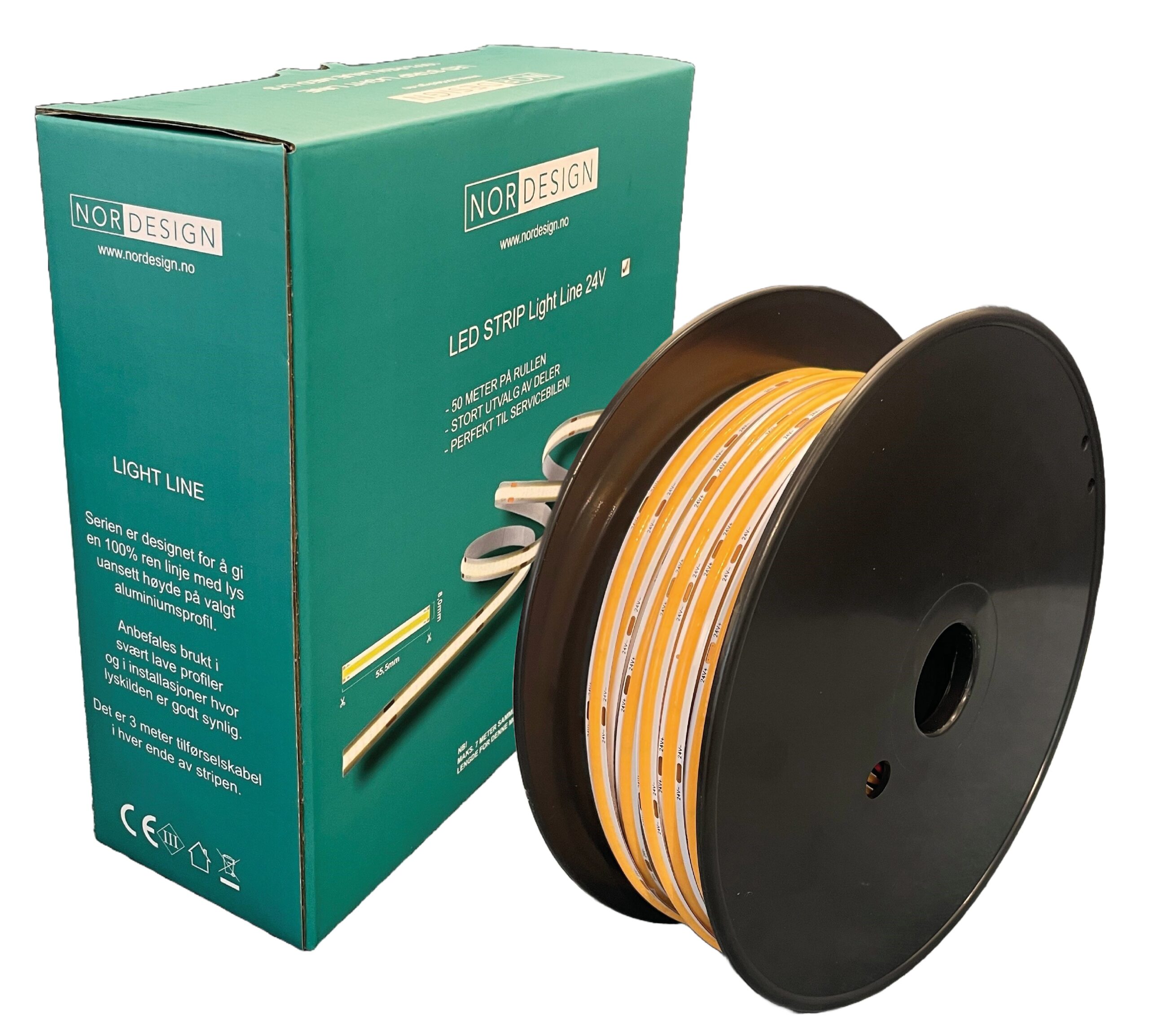LED-Strip ligger på trommel og ønsket lengde trekkes enkelt ut av esken og klippes av ved klippepunkt. Stort utvalg endetilkoblinger og skjøter. Perfekt løsning å ha i servicebilen og på lagerhylla.