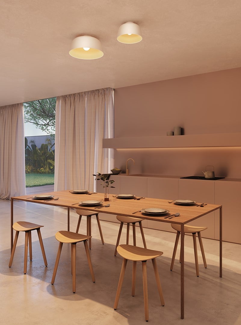 Med glatte og diskrete linjer er Miso en dekorativ og funksjonell taklampe som tilpasser seg ethvert rom. Tilgjengelig i to størrelser og to farger, noe som gir serien stor fleksibilitet gjennom muligheten til å leke med kombinasjonene av ulike størrelser i samme miljø.