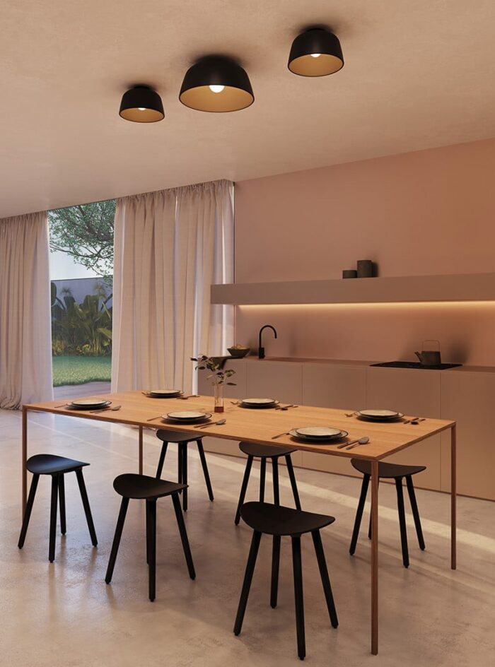 Med glatte og diskrete linjer er Miso en dekorativ og funksjonell taklampe som tilpasser seg ethvert rom. Tilgjengelig i to størrelser og to farger, noe som gir serien stor fleksibilitet gjennom muligheten til å leke med kombinasjonene av ulike størrelser i samme miljø.