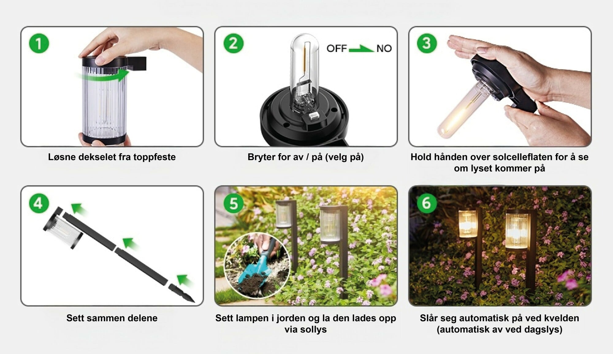 - Smart og selvgående: Lampen lader i 6–8 timer i dagslys og skrur seg automatisk på ved skumring. Den lyser opp de sene nattetimene i hele 10–12 timer før den slår seg av når solen står opp igjen.